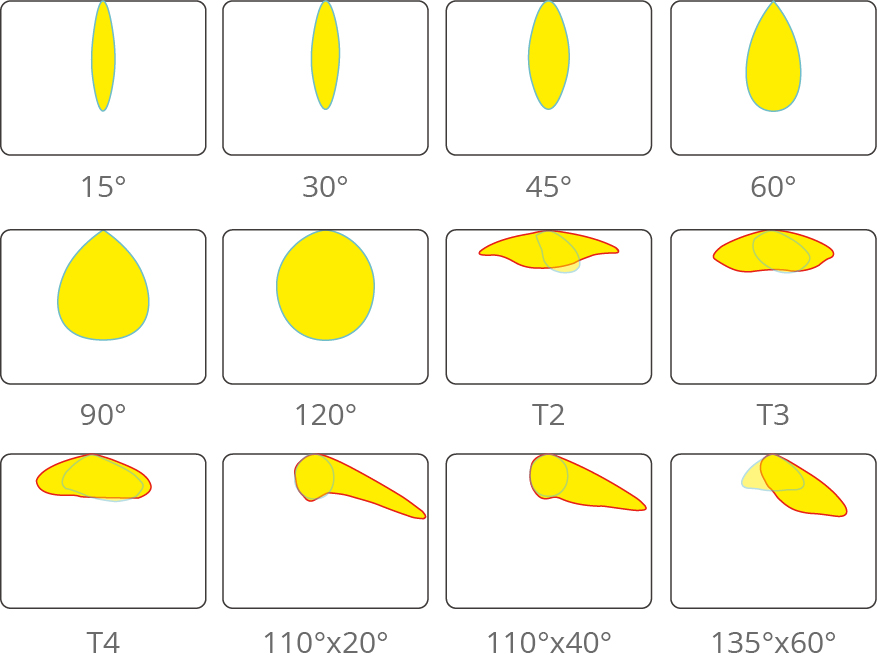 ● Beam angle: 15°/30°/45°/60°/90°/ 120°/Type II/Type III/Type IV/110°×20°/110°×40°/135°×60°.